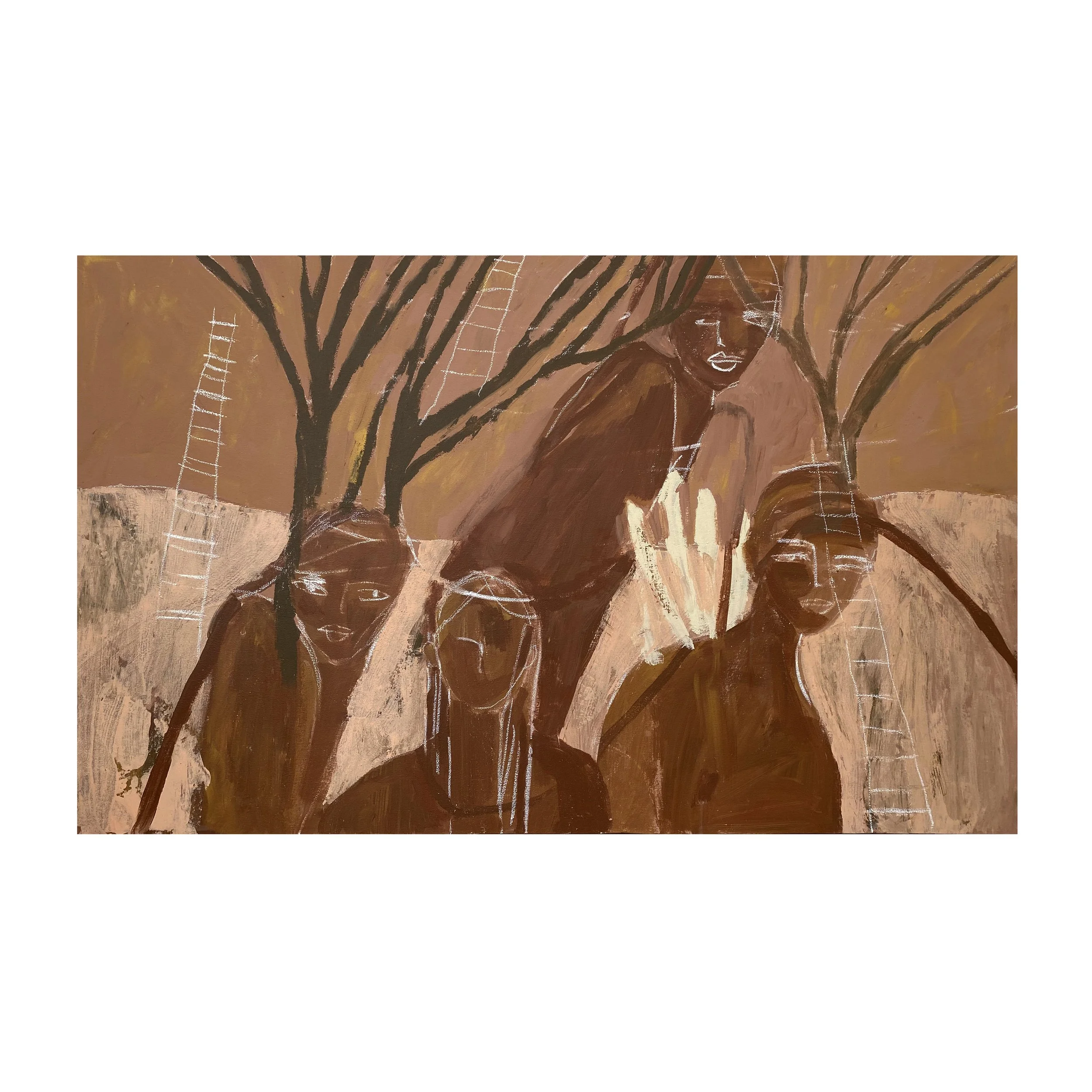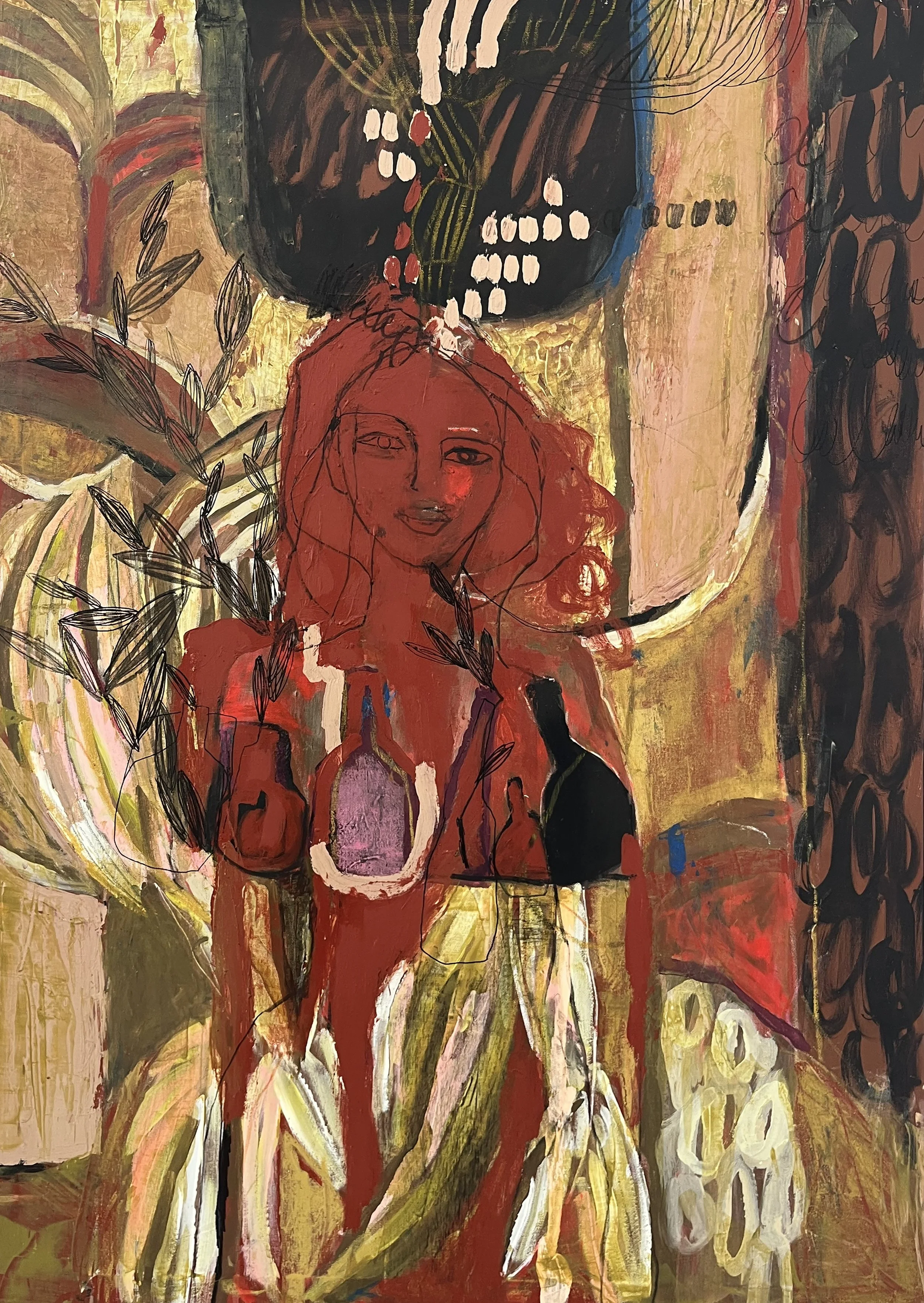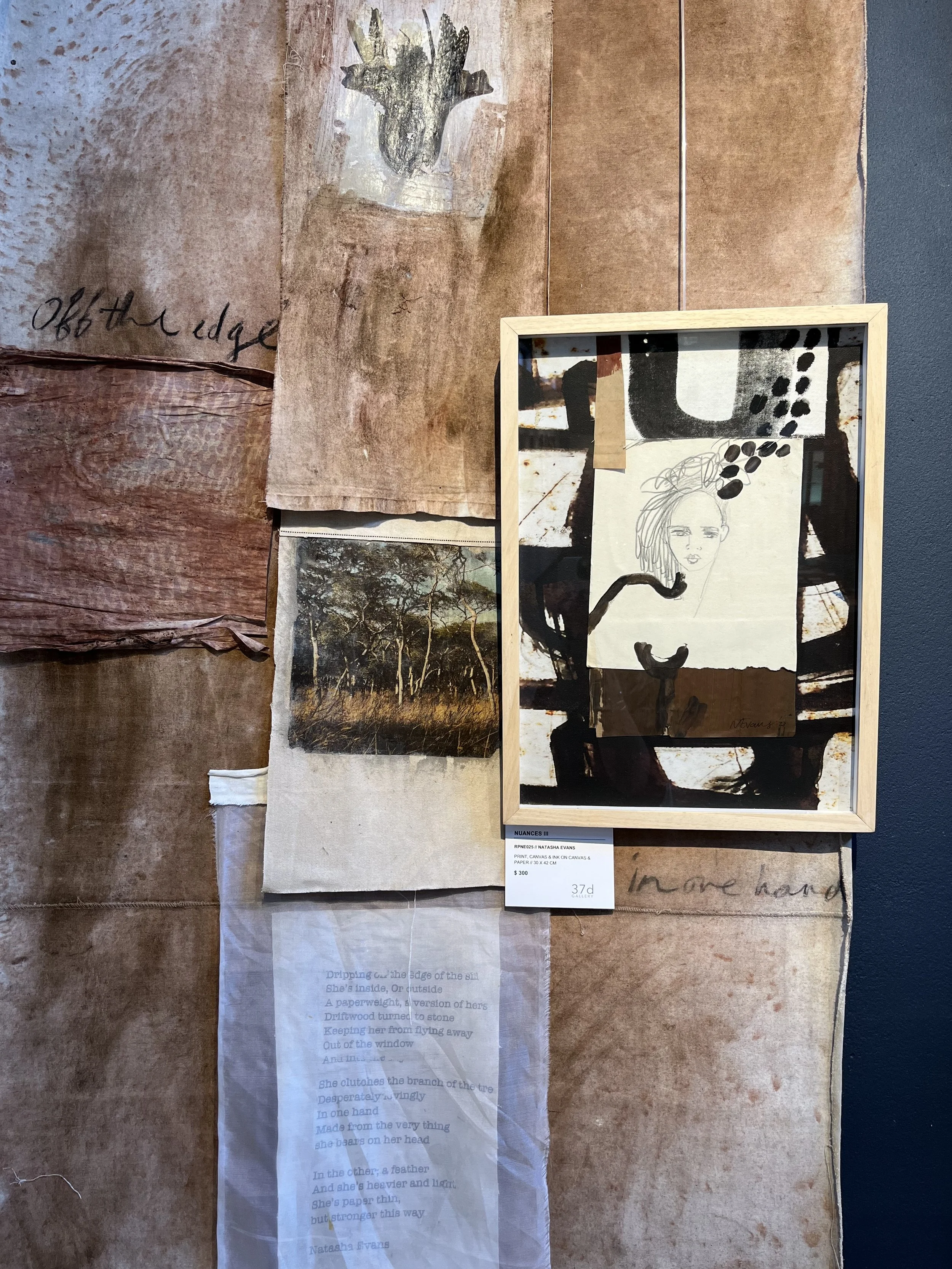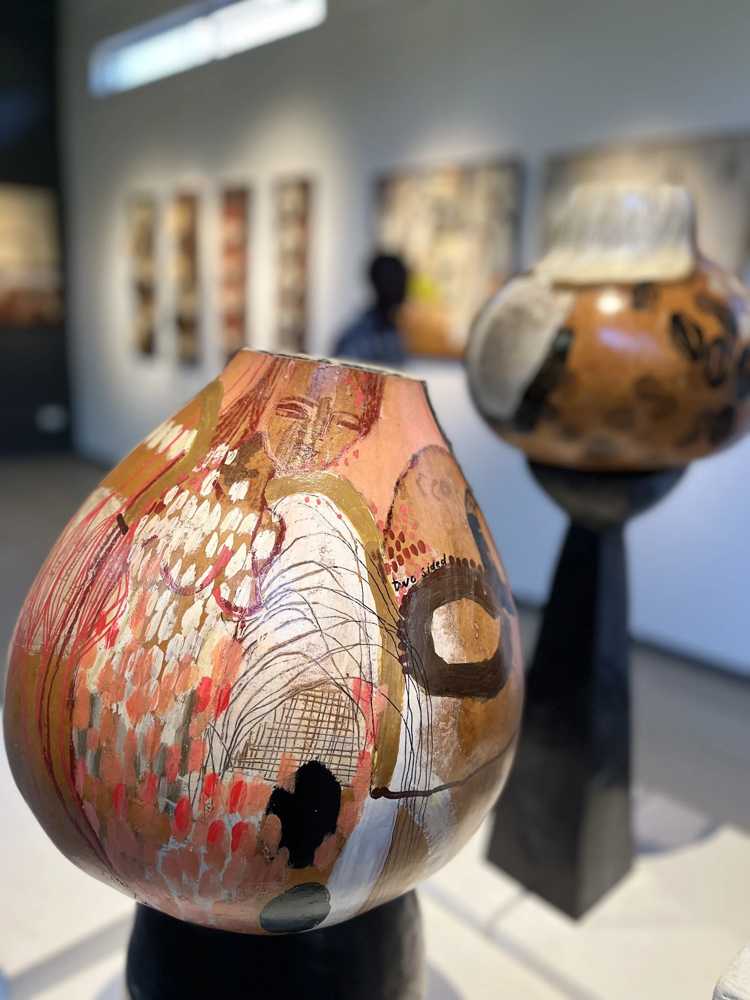 A primal emotive response to raw feelings, memories and the shared experience. The chosen palette was my conceptual starting point and so the body of work evolved with earth tones, organic forms and mediums with ‘raw edges’ dominate and speak to the natural and real-states, metaphors for tenderness and pain and the fragility and robustness in life and death. The mixed media paintings carry abstract narratives and incorporate layers of drawing, painting, etching, textures, color fields, transfer photography and signature mark making. The vulnerable figurative depictions explore subconscious, childhood memory and womanhood that look to instill emotions that transcend time, class and demographics. The titles of the pieces in this body of work are functional (as true with all my work) and play an important role in creating a gateway in the gaps; a three-way between the aesthetic, material and linguistic. I continue to explore the theme of the vessel and show a collection of painted calabash and carved wood pedestal, the metaphor for the woman as the carrier and the plinth the counterpart. I repeat the motif in the drawings on paper and the etched paintings in cork and then also in a new exploration of it’s symbolism, in a series of still life paintings, where nature inspired marks and botanical line are interwoven . The body of work is interplayed with a tactile installation, a hanging layered tapestry. Three strips of earth stained canvas with segments and layers of torn textile, text and photographic imagery, playing with transparency, order, method, divides and connection. Materials go beyond the traditional with rusted metal, wood, organic forms and cork which are in conversation with the works on canvas and paper, to achieve an immersive experience that triggers the connections the chosen theme. Portrayals of the inner in relation to the outer - tender, raw and unapologetic.