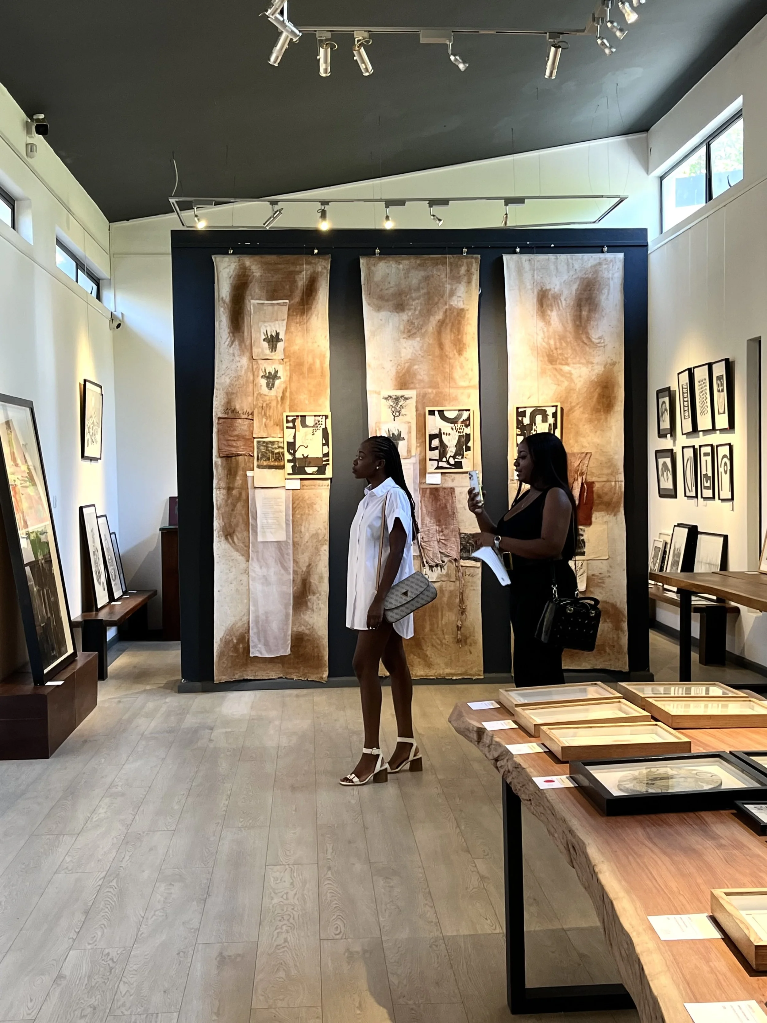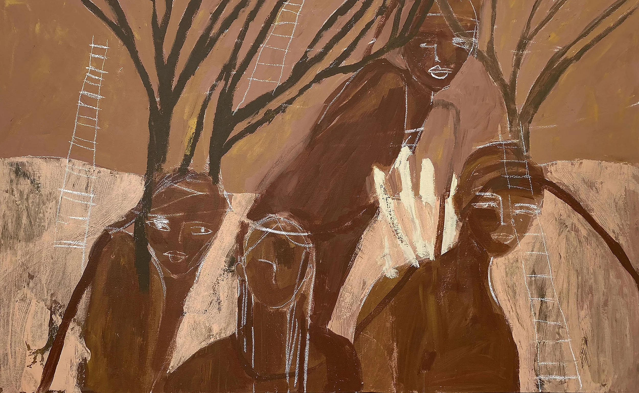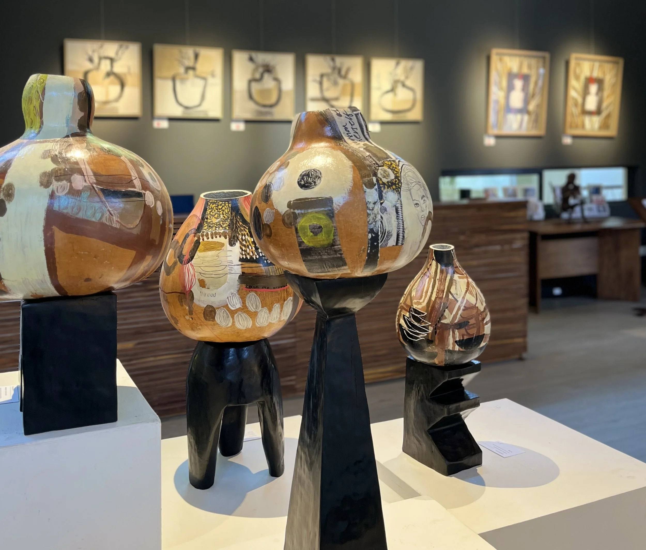 A primal emotive response to raw feelings, memories and the shared experience. The chosen palette was my conceptual starting point and so the body of work evolved with earth tones, organic forms and mediums with ‘raw edges’ dominate and speak to the natural and real-states, metaphors for tenderness and pain and the fragility and robustness in life and death. The mixed media paintings carry abstract narratives and incorporate layers of drawing, painting, etching, textures, color fields, transfer photography and signature mark making. The vulnerable figurative depictions explore subconscious, childhood memory and womanhood that look to instill emotions that transcend time, class and demographics. The titles of the pieces in this body of work are functional (as true with all my work) and play an important role in creating a gateway in the gaps; a three-way between the aesthetic, material and linguistic. I continue to explore the theme of the vessel and show a collection of painted calabash and carved wood pedestal, the metaphor for the woman as the carrier and the plinth the counterpart. I repeat the motif in the drawings on paper and the etched paintings in cork and then also in a new exploration of it’s symbolism, in a series of still life paintings, where nature inspired marks and botanical line are interwoven . The body of work is interplayed with a tactile installation, a hanging layered tapestry. Three strips of earth stained canvas with segments and layers of torn textile, text and photographic imagery, playing with transparency, order, method, divides and connection. Materials go beyond the traditional with rusted metal, wood, organic forms and cork which are in conversation with the works on canvas and paper, to achieve an immersive experience that triggers the connections the chosen theme. Portrayals of the inner in relation to the outer - tender, raw and unapologetic.