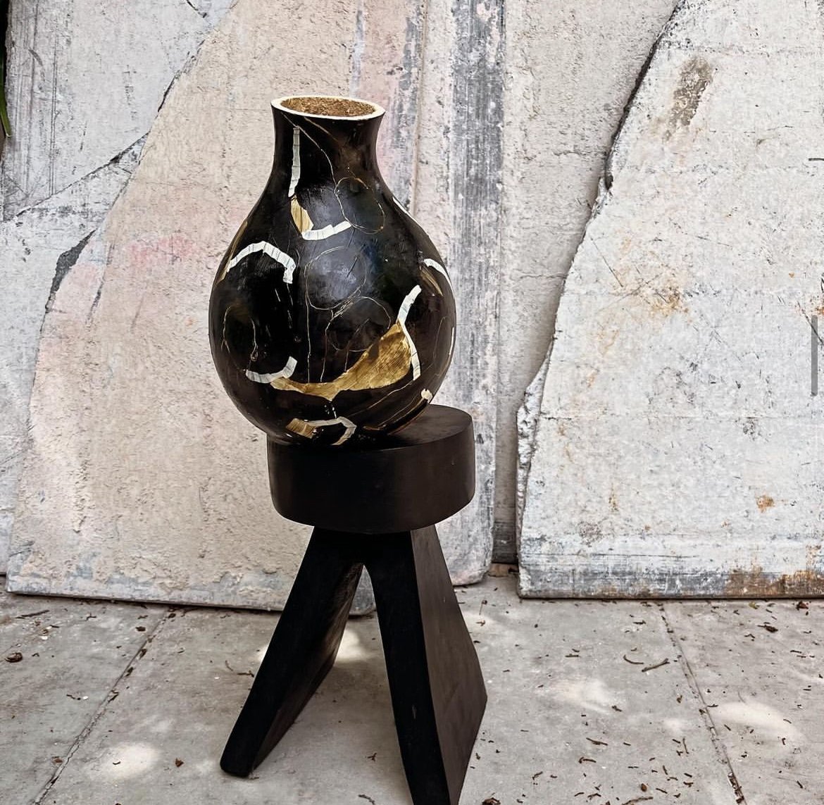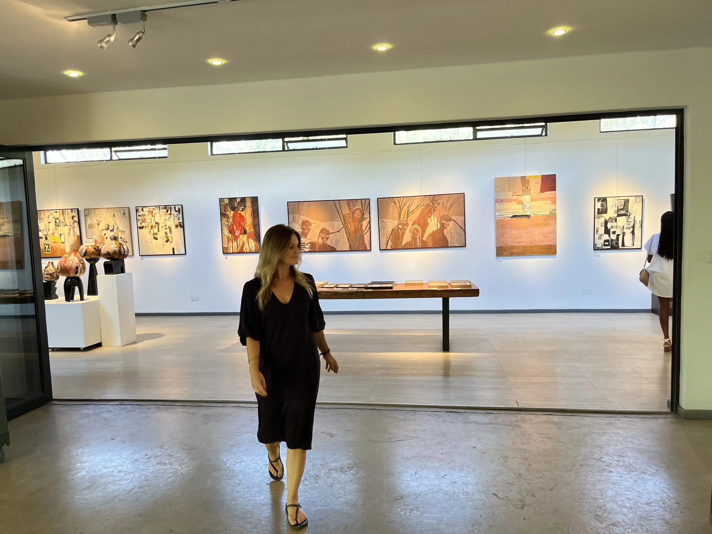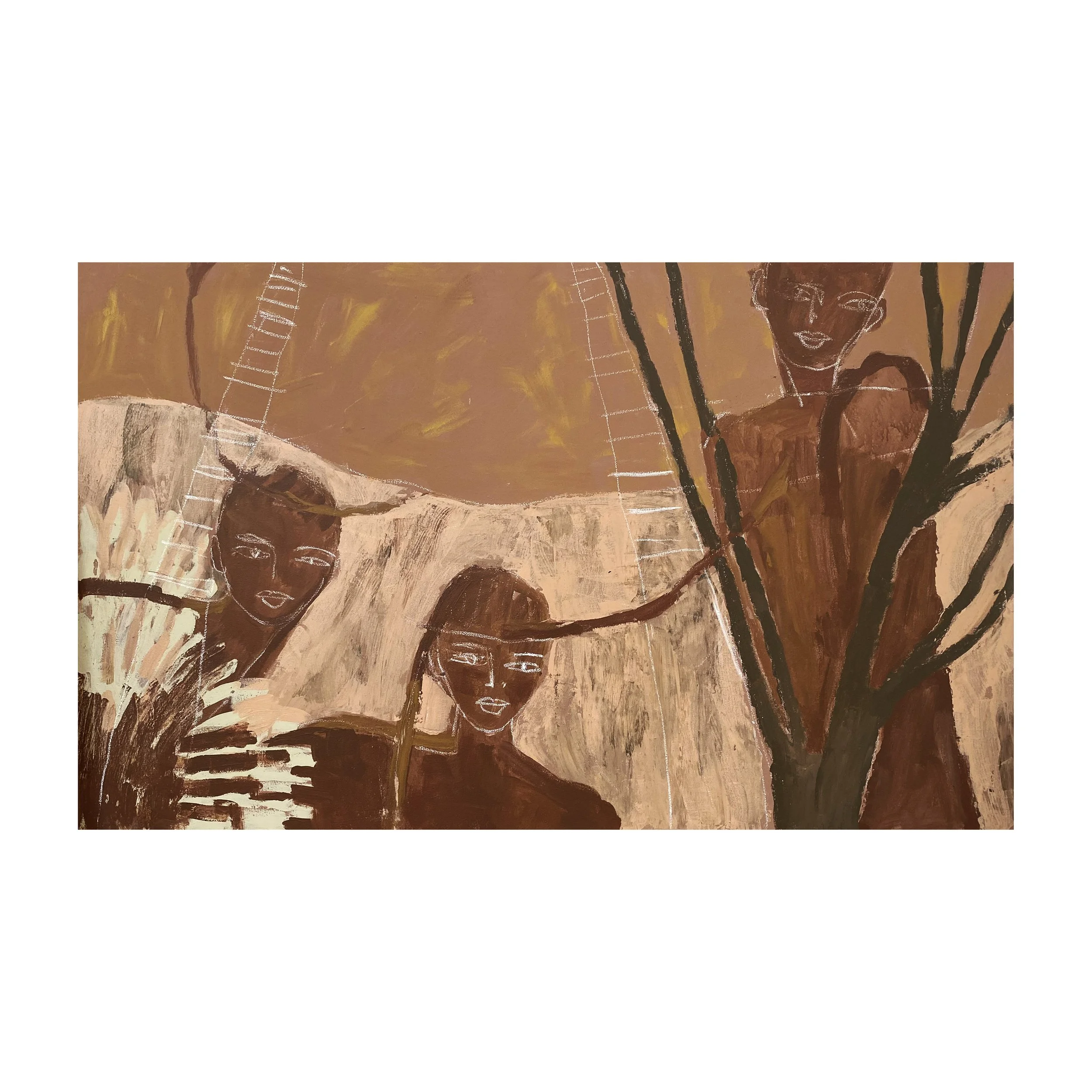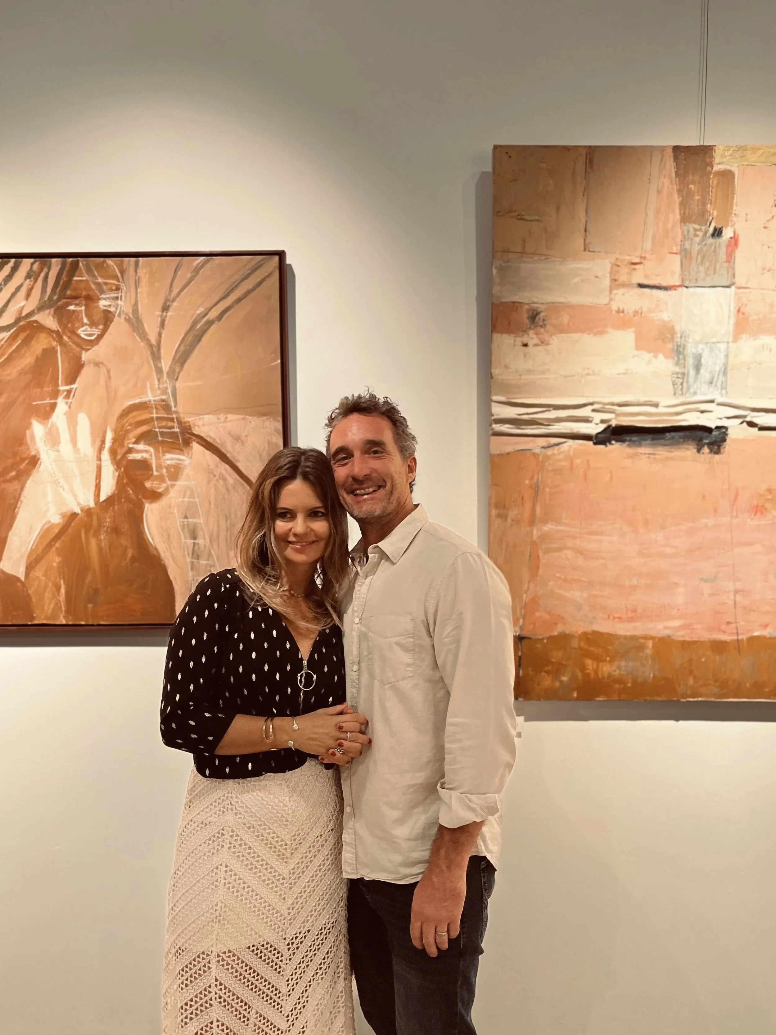 A primal emotive response to raw feelings, memories and the shared experience. The chosen palette was my conceptual starting point and so the body of work evolved with earth tones, organic forms and mediums with ‘raw edges’ dominate and speak to the natural and real-states, metaphors for tenderness and pain and the fragility and robustness in life and death. The mixed media paintings carry abstract narratives and incorporate layers of drawing, painting, etching, textures, color fields, transfer photography and signature mark making. The vulnerable figurative depictions explore subconscious, childhood memory and womanhood that look to instill emotions that transcend time, class and demographics. The titles of the pieces in this body of work are functional (as true with all my work) and play an important role in creating a gateway in the gaps; a three-way between the aesthetic, material and linguistic. I continue to explore the theme of the vessel and show a collection of painted calabash and carved wood pedestal, the metaphor for the woman as the carrier and the plinth the counterpart. I repeat the motif in the drawings on paper and the etched paintings in cork and then also in a new exploration of it’s symbolism, in a series of still life paintings, where nature inspired marks and botanical line are interwoven . The body of work is interplayed with a tactile installation, a hanging layered tapestry. Three strips of earth stained canvas with segments and layers of torn textile, text and photographic imagery, playing with transparency, order, method, divides and connection. Materials go beyond the traditional with rusted metal, wood, organic forms and cork which are in conversation with the works on canvas and paper, to achieve an immersive experience that triggers the connections the chosen theme. Portrayals of the inner in relation to the outer - tender, raw and unapologetic.