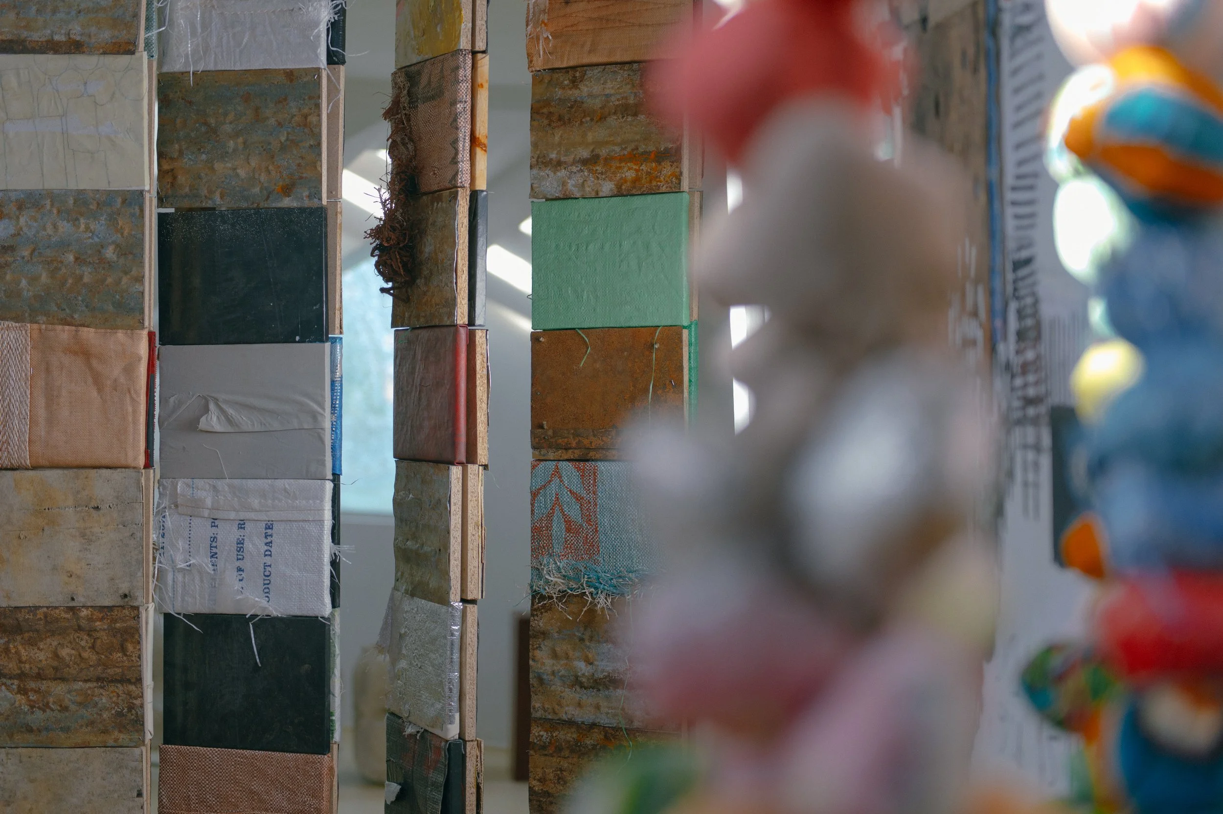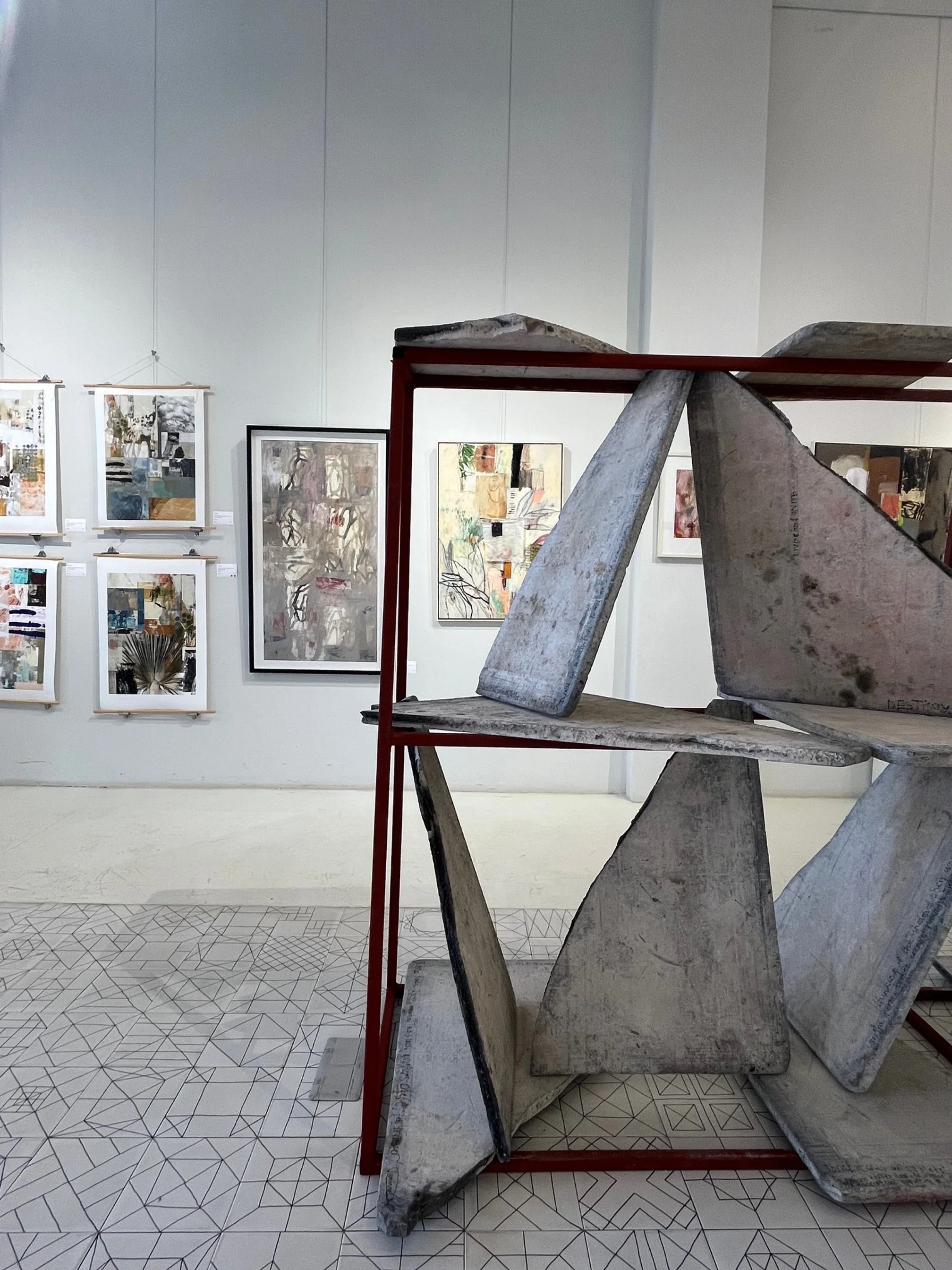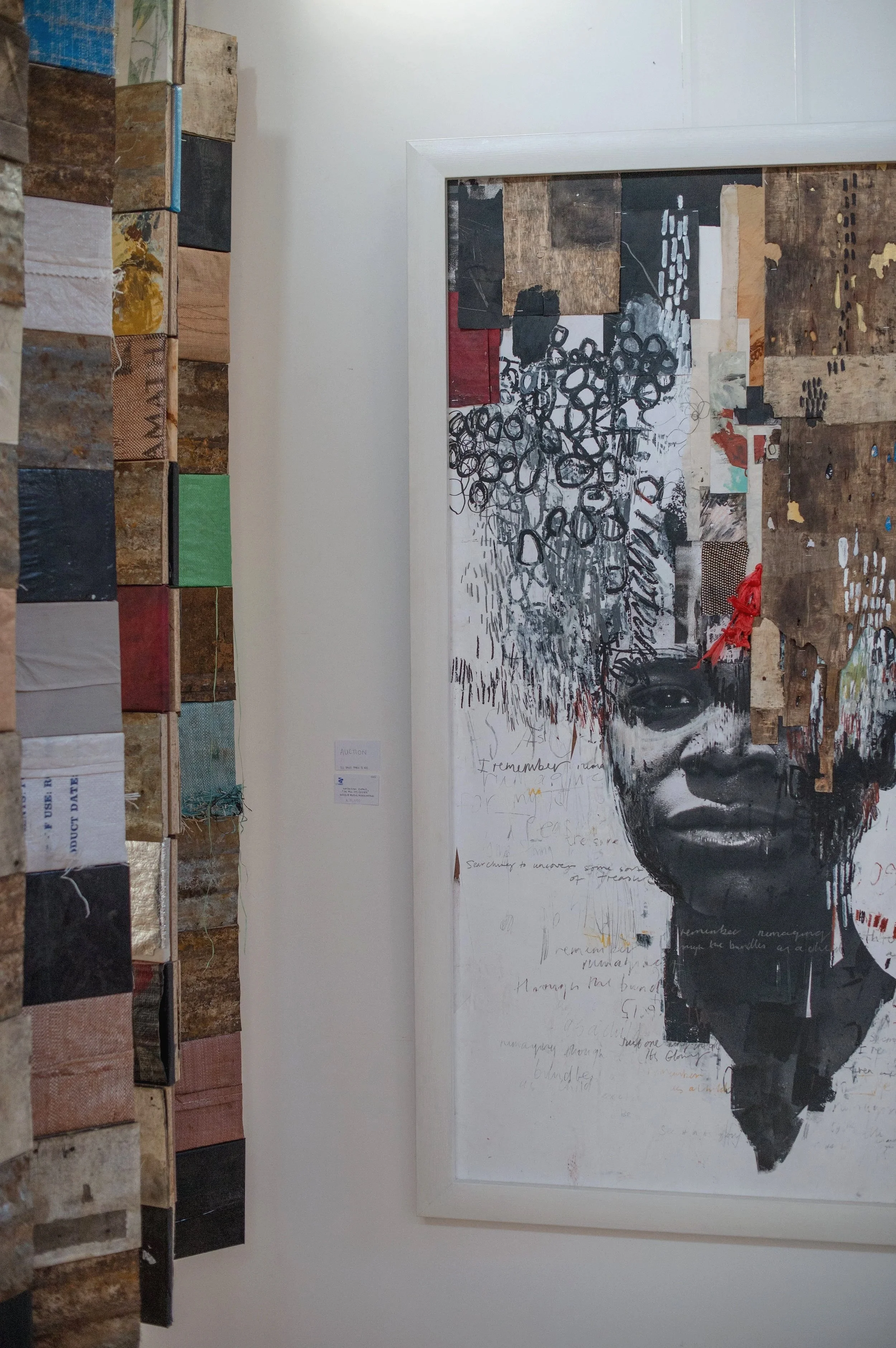 A solo exhibition of works self curated and represented, showcased at The Space, pop-up gallery Agora Village Lusaka. The new body of work was made over a 12 month period and saw a freshness and lightness in comparison to my works exhibited in the previous years collection, with a palette of soft pinks, greys, lilacs and greens but balanced with heavier blocks of color and vigorous mark making to achieve a disruption and an unsettled movement. A push and pull, leading with the idea that there is beauty in imperfection on the face of it but also notice the imperfection and make room for the uncomfortable, we begin to find something else. This intention is aligned with my appreciation of dualities, soft and hard, dark and light, ordered and chaotic, lost and found, in order to extract meaning. Through the paintings on canvas and paper and the central installations, I wanted to bring to light both the deeply moving and deeply troubling aspects of the human condition. Through the work I express my grapple with emotions, drawing from my journal writings and translating these into the installations using words, phrases, extracts etched into the surface with a soldering iron and again with discarded symbolic objects and fragments hand stitched with textile and form . The artworks evolved from a deeper consideration of current socio-political issues, most specifically with the Palestinian-Israeli conflict, affecting cultural landscapes and identity and posing personal unsettling questions. This exploration of identity in a new context led me to take a closer look at the tapestry of my own life, childhood experiences and reflecting on my personal relationships with my mother and father and those I know and love. The installations ‘House Of Cards’ and ‘Stories On My Chest’ were a central to the body of work. They were site specific and placed in the middle of the room in order to cause an obstruction, become an ‘elephant in the room’, a confrontation of the ‘valued’ side by side with the throwaway, mirroring the nuance in how we choose to see and acknowledge certain things and other things that perhaps make us uncomfortable, we ignore and pretend do not exist. The exhibition as a whole was both deeply personal, revealing my own empathies and vulnerabilities but was also an attempt to connect with the viewer on a deeper level. I continue to explore juxtaposition, paradox and experiment with the physical (material) as metaphor, noticing what is conterintuitive but true. The sensitive narrative was not altogether hidden but rather subtlety and gently expressed through text, palette and material. It was an opportunity for me to exercise a daringness that associates the absence of fear and a feeling of being alive..