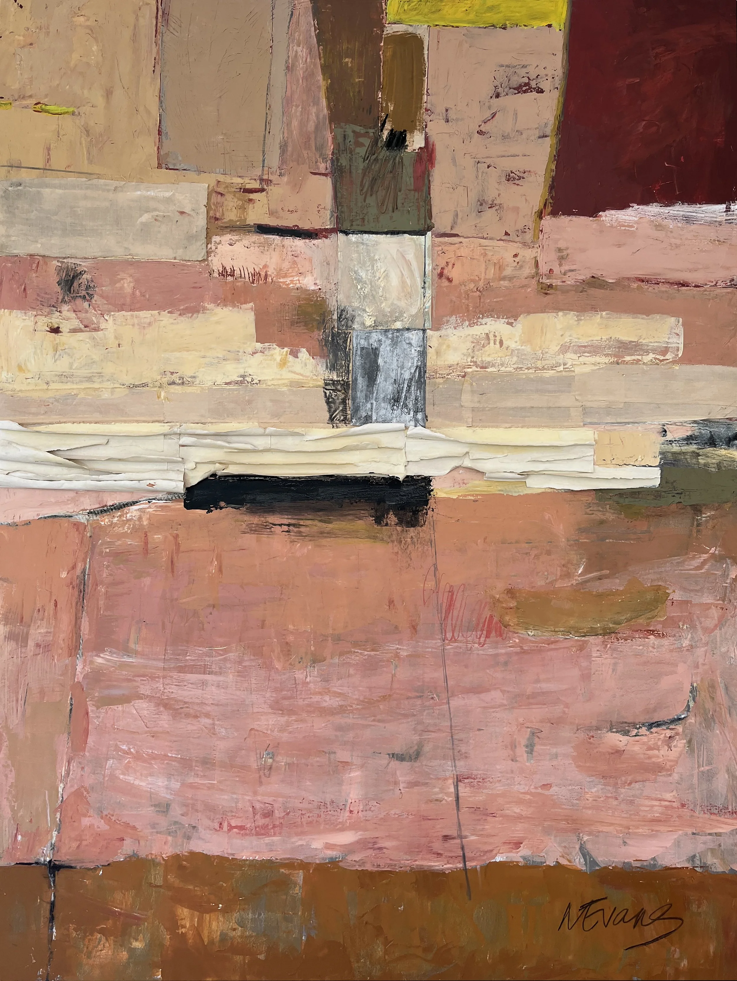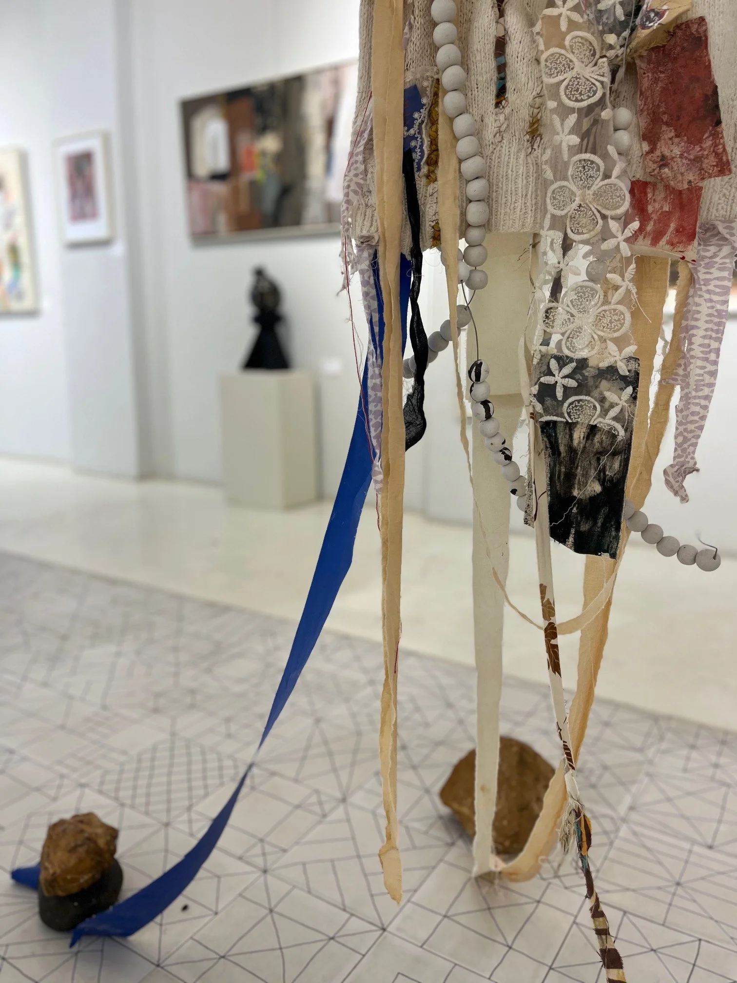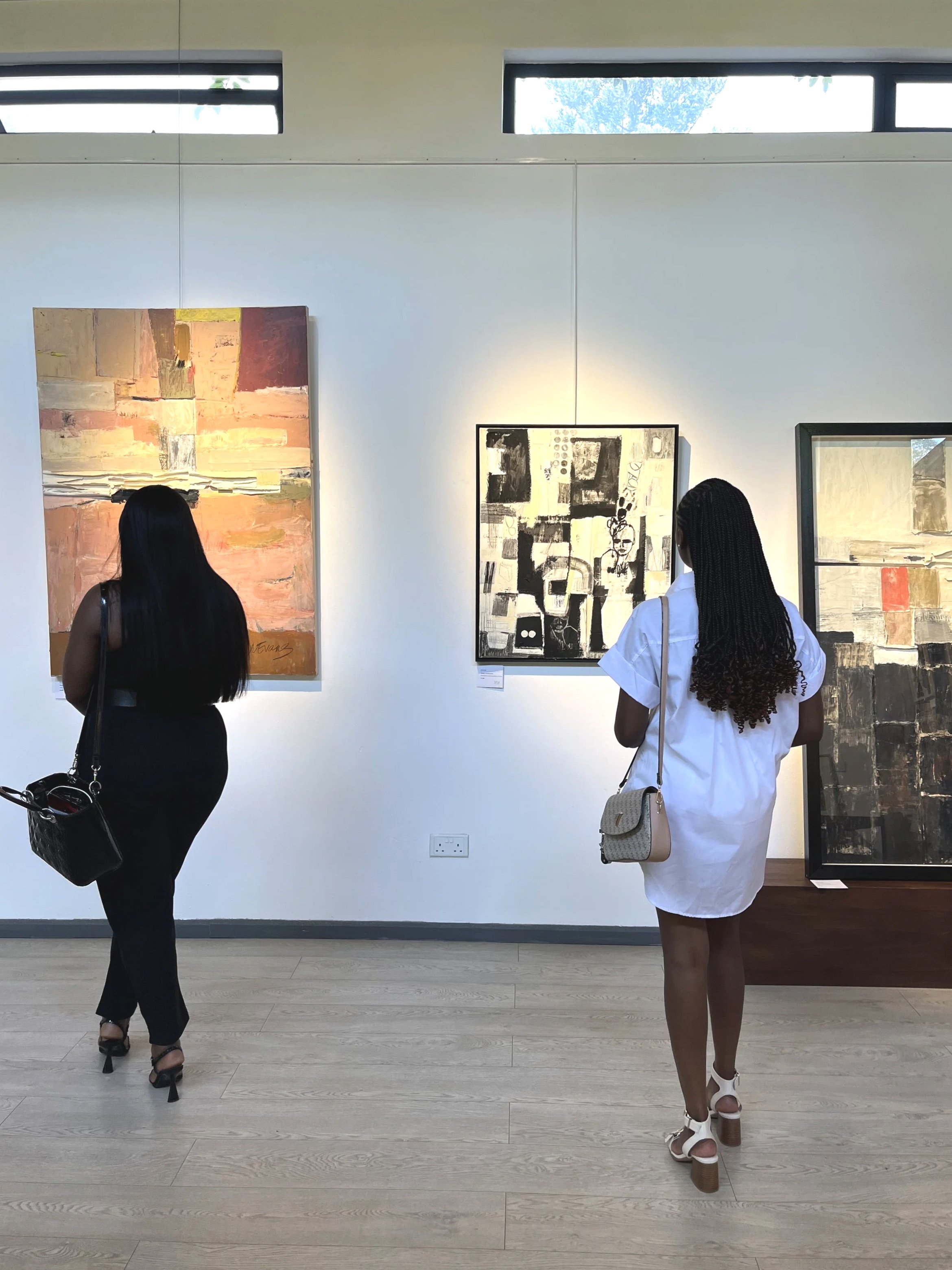 A solo exhibition of works self curated and represented, showcased at The Space, pop-up gallery Agora Village Lusaka. The new body of work was made over a 12 month period and saw a freshness and lightness in comparison to my works exhibited in the previous years collection, with a palette of soft pinks, greys, lilacs and greens but balanced with heavier blocks of color and vigorous mark making to achieve a disruption and an unsettled movement. A push and pull, leading with the idea that there is beauty in imperfection on the face of it but also notice the imperfection and make room for the uncomfortable, we begin to find something else. This intention is aligned with my appreciation of dualities, soft and hard, dark and light, ordered and chaotic, lost and found, in order to extract meaning. Through the paintings on canvas and paper and the central installations, I wanted to bring to light both the deeply moving and deeply troubling aspects of the human condition. Through the work I express my grapple with emotions, drawing from my journal writings and translating these into the installations using words, phrases, extracts etched into the surface with a soldering iron and again with discarded symbolic objects and fragments hand stitched with textile and form . The artworks evolved from a deeper consideration of current socio-political issues, most specifically with the Palestinian-Israeli conflict, affecting cultural landscapes and identity and posing personal unsettling questions. This exploration of identity in a new context led me to take a closer look at the tapestry of my own life, childhood experiences and reflecting on my personal relationships with my mother and father and those I know and love. The installations ‘House Of Cards’ and ‘Stories On My Chest’ were a central to the body of work. They were site specific and placed in the middle of the room in order to cause an obstruction, become an ‘elephant in the room’, a confrontation of the ‘valued’ side by side with the throwaway, mirroring the nuance in how we choose to see and acknowledge certain things and other things that perhaps make us uncomfortable, we ignore and pretend do not exist. The exhibition as a whole was both deeply personal, revealing my own empathies and vulnerabilities but was also an attempt to connect with the viewer on a deeper level. I continue to explore juxtaposition, paradox and experiment with the physical (material) as metaphor, noticing what is conterintuitive but true. The sensitive narrative was not altogether hidden but rather subtlety and gently expressed through text, palette and material. It was an opportunity for me to exercise a daringness that associates the absence of fear and a feeling of being alive..