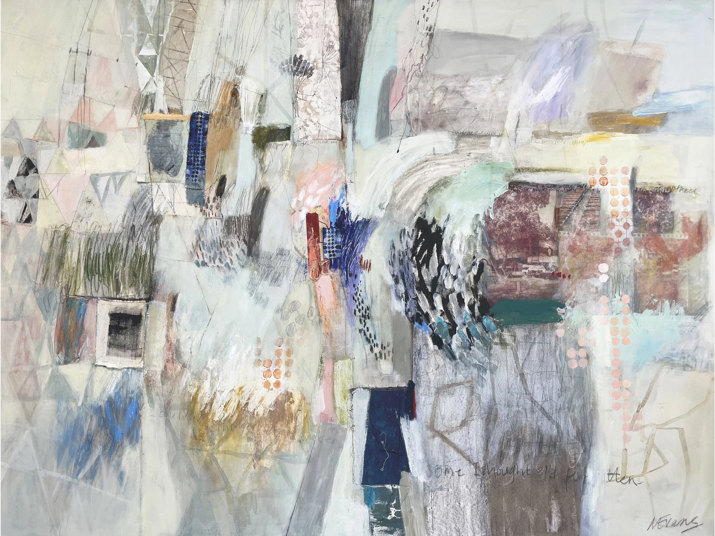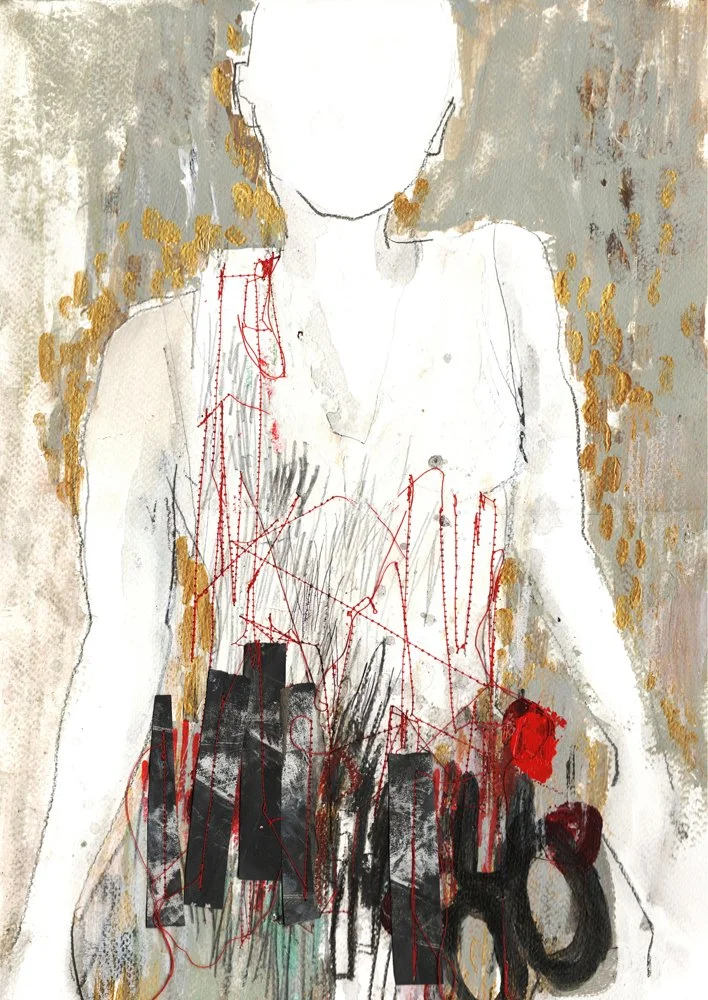 In the larger canvas works, transferred photography images, text, gestural drawing, lines and spontaneous mark making can be seen on top painted or layered backgrounds. Hand drawn text and collaged drawn and painted elements result in ‘chaotic’ compositions that invite the viewer to explore the paintings from their edges rather than from the center out.