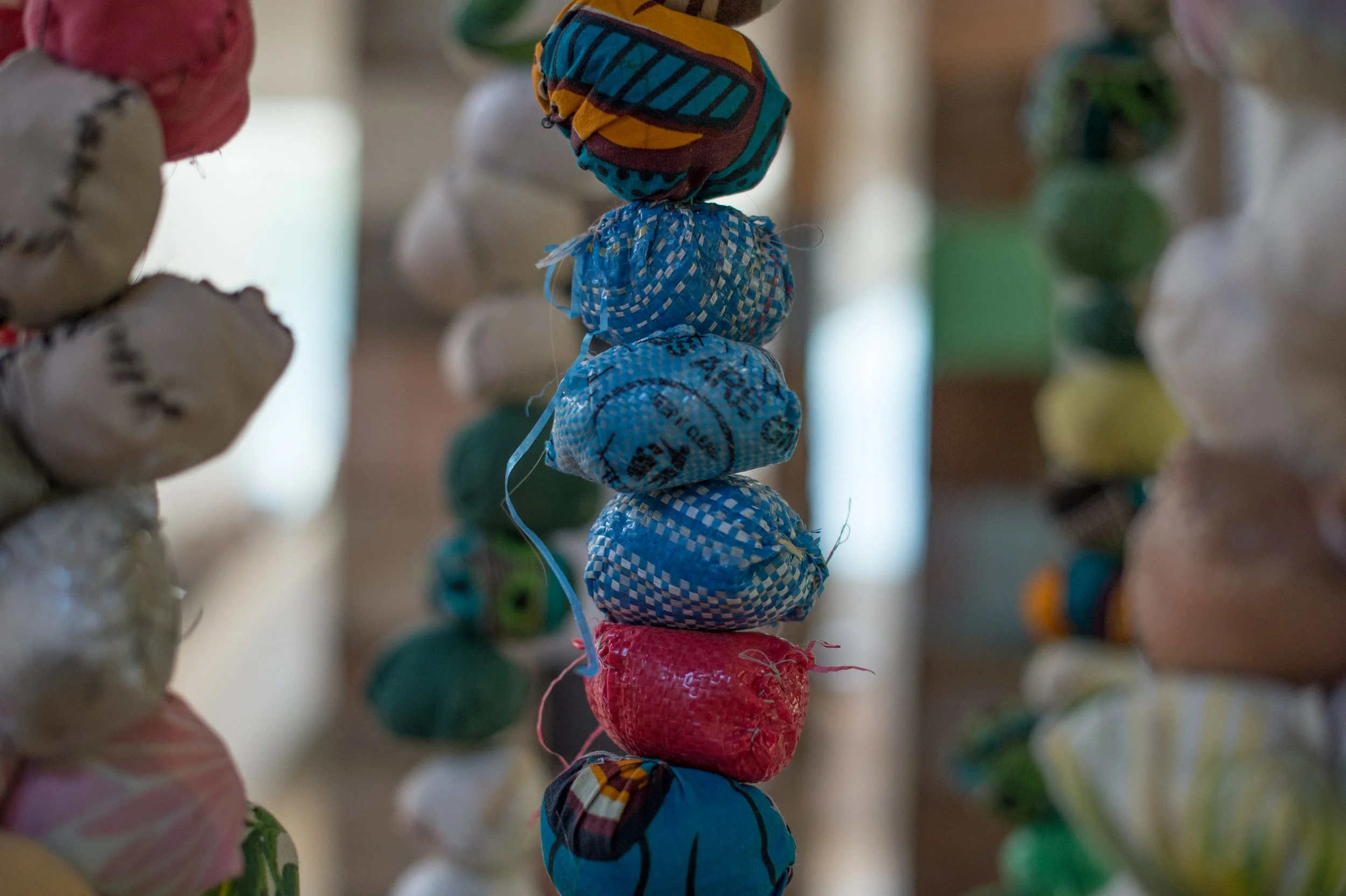 I worked with a small group of farm worker ladies to stitch the balls. Connecting with the women through this helped me visualize and link ideas of individuality and the interconnection of people from different groups of society. Found waste material as well as personal discarded clothes and textiles were used, which added the human bodily aspect.